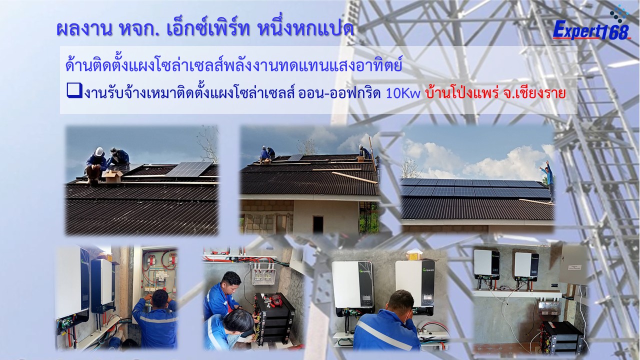 ผลงาน หจก. เอ็กซ์เพิร์ท หนึ่งหกแปด ด้านติดตั้งแผงโซล่าเซลส์พลังงานทดแทนแสงอาทิตย์ งานรับจ้างเหมาติดตั้งแผงโซล่าเซลส์ ออน-ออฟกริด 10Kw บ้านโป่งแพร่ จ.เชียงราย